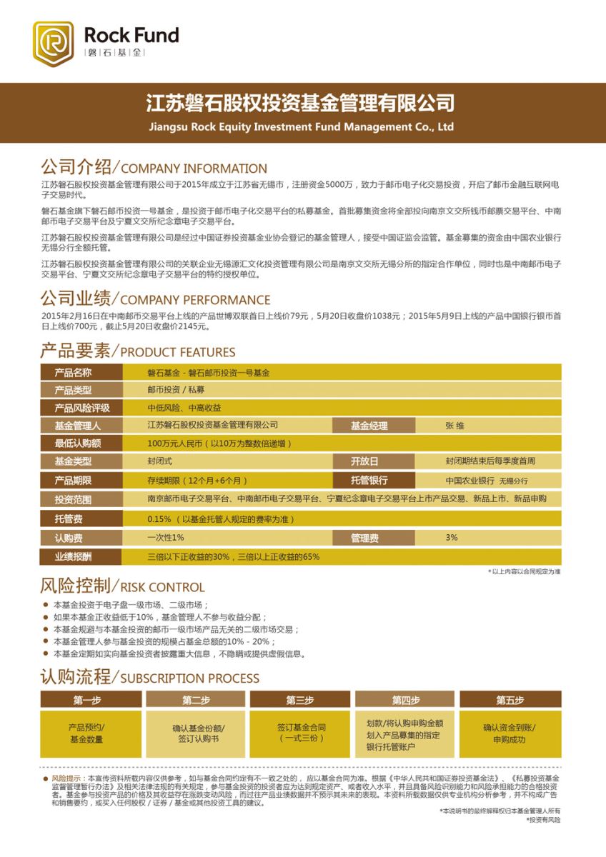 磐石基金旗下磐石郵幣投資一號(hào)基金,是投資于郵幣電子化交易平臺(tái)的私募基金。首批募集資金全部投向南京文交所錢幣郵票交易中心、中南郵票交易中心等電子交易平臺(tái)。該基金預(yù)期年化收益30%,產(chǎn)品收益高于同期銀行理財(cái)、信托、債券等固定收益產(chǎn)品。
